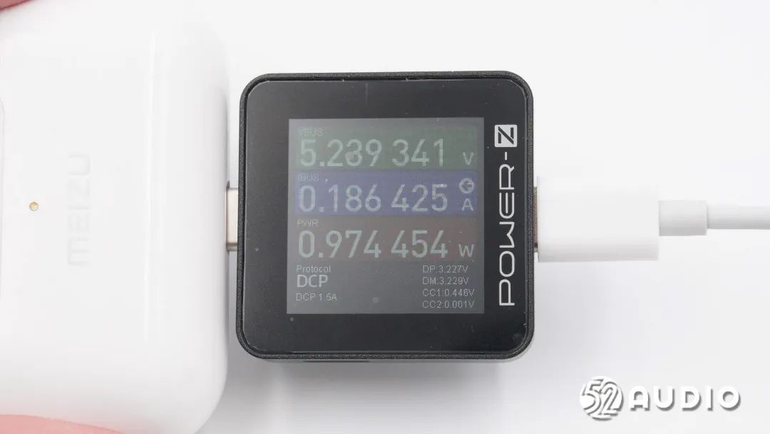 我爱音频网采用CHARGERLAB POWER-Z KM002C对魅族POP Pro真无线降噪耳机进行有线充电测试,充电功率约为0.97W