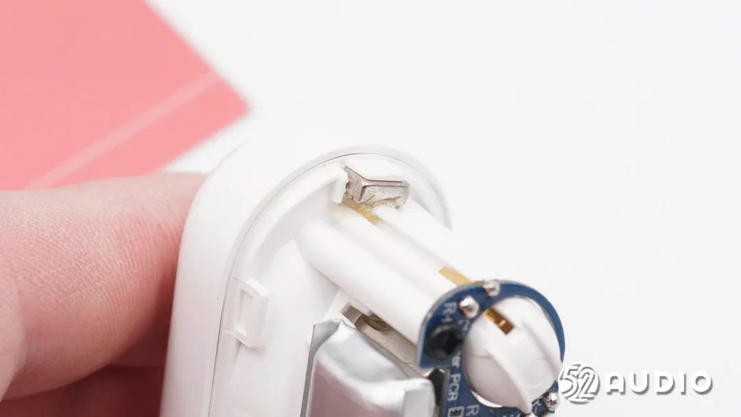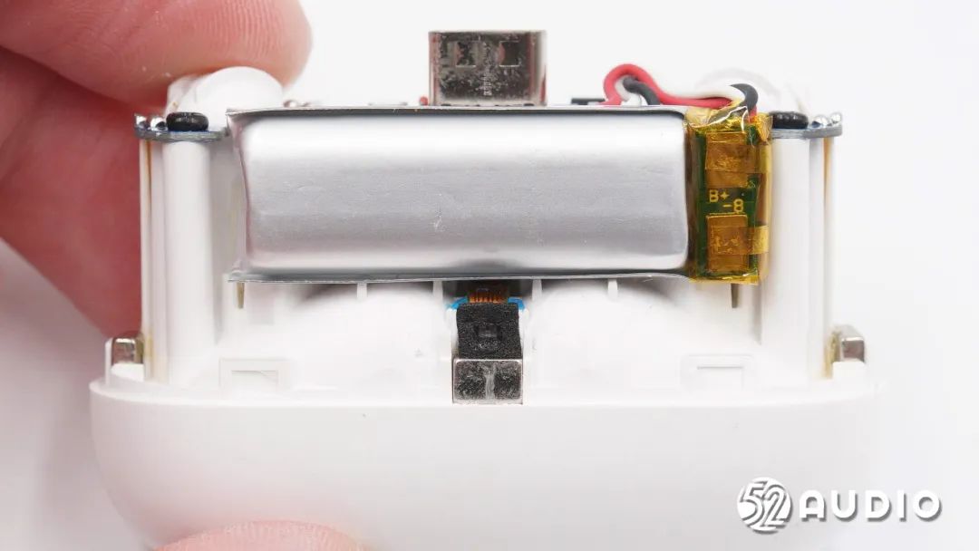 取出电池,前腔内部还设置有金属盖板隔离,用于降低干扰,提升声学性能。