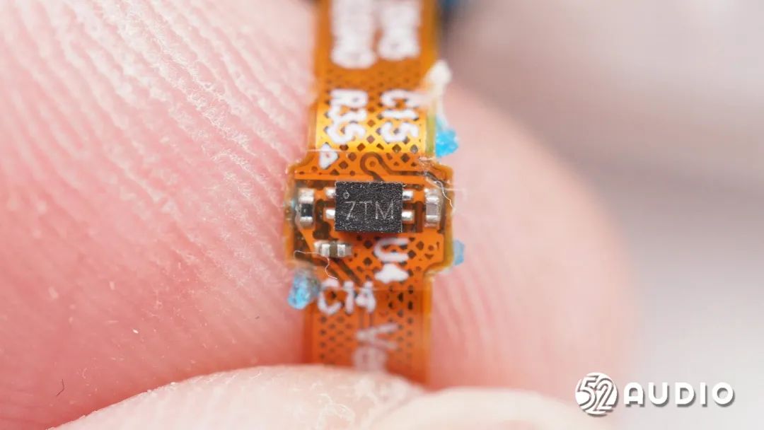 丝印7TM的霍尔元件,用于感知充电盒开启/关闭时的磁场变化,进而通知充电盒MCU和耳机与已连接设备配对或断开连接。