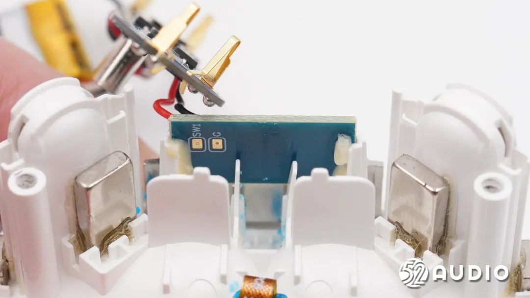 卸掉螺丝取掉主板和电池,PCB小板另外一侧没有元器件;座舱上还固定有两块磁铁,用于更好的吸附固定耳机。