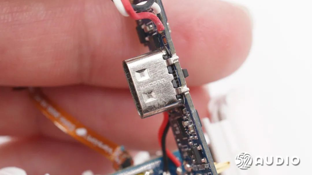 Type-C充电母座特写,过孔焊接固定。