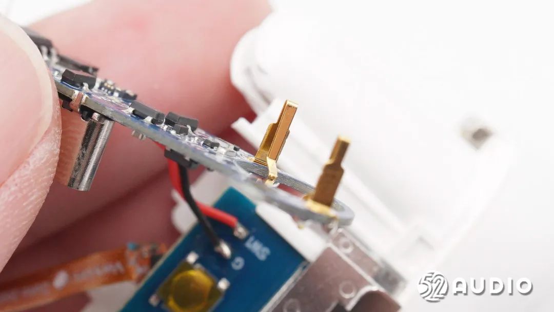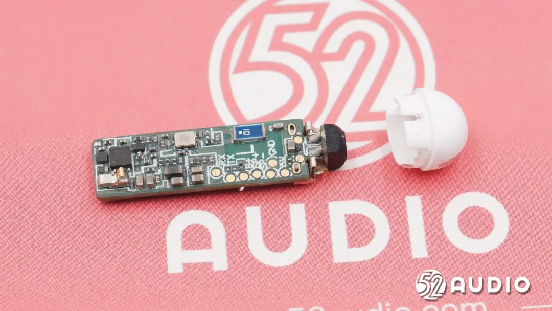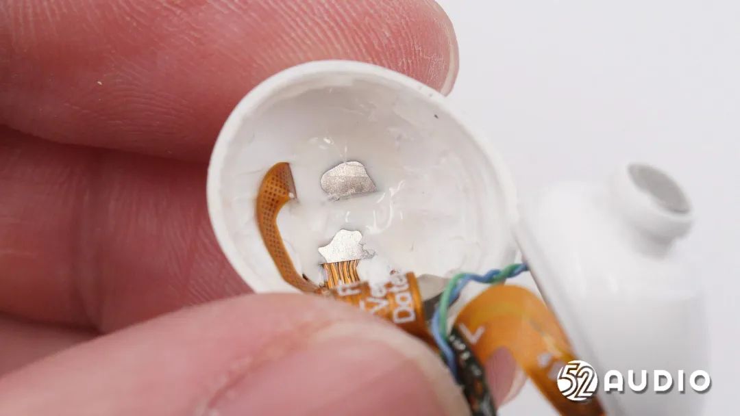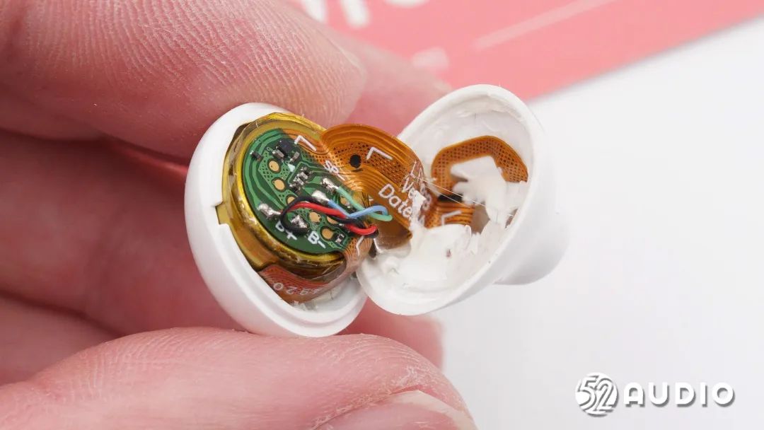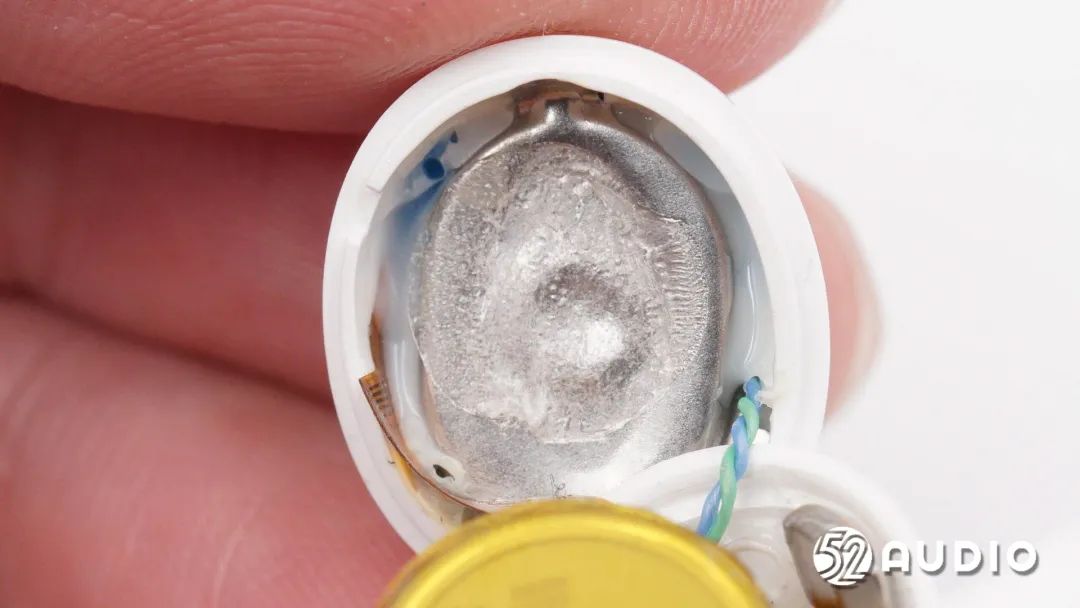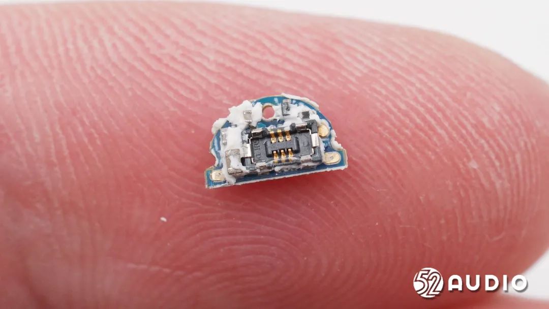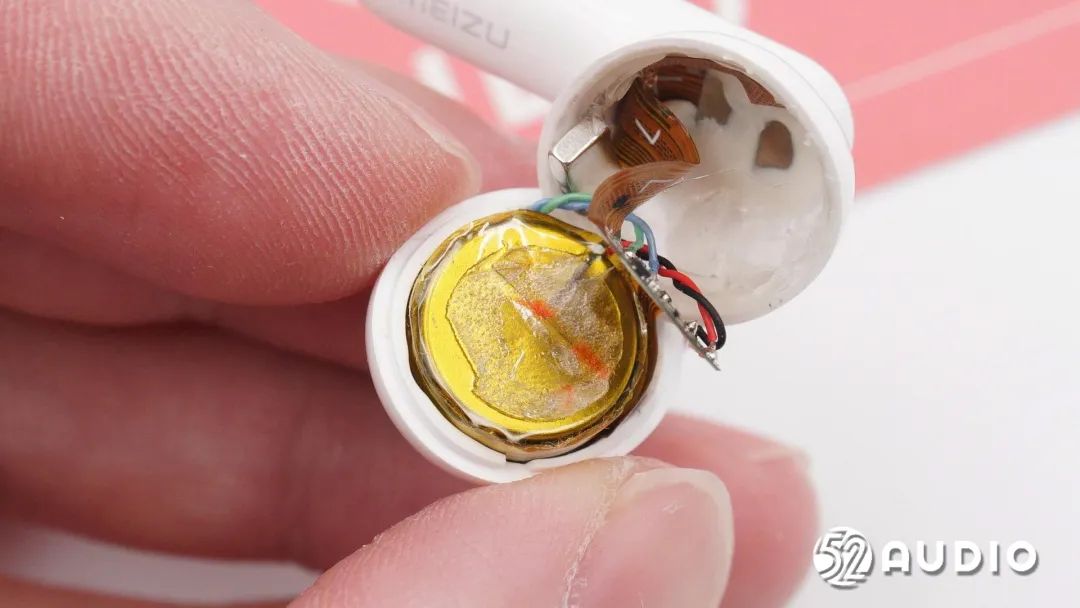 耳机头内部组件顺利获得排线连接到耳机柄内主板,电池上方贴有一片圆形小板。