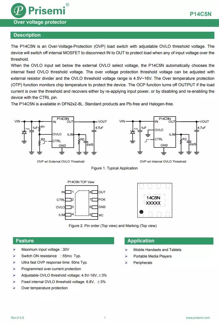 Prisemi芯导科技P14C5N为过压过流保护芯片,P14C5N支持输入过压和欠压保护,电路启动后的过流保护。当输入电压超过输入过压保护阈值时,器件会关闭内置的MOSFET断开输入和输出的连接。