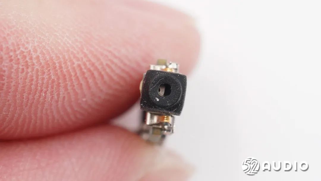 扬声器下方内窥降噪麦克风特写,为镭雕2015 3X09MEMS麦克风,同样来自豪门国际电子,用于降噪功能拾取耳道内部环境噪音。