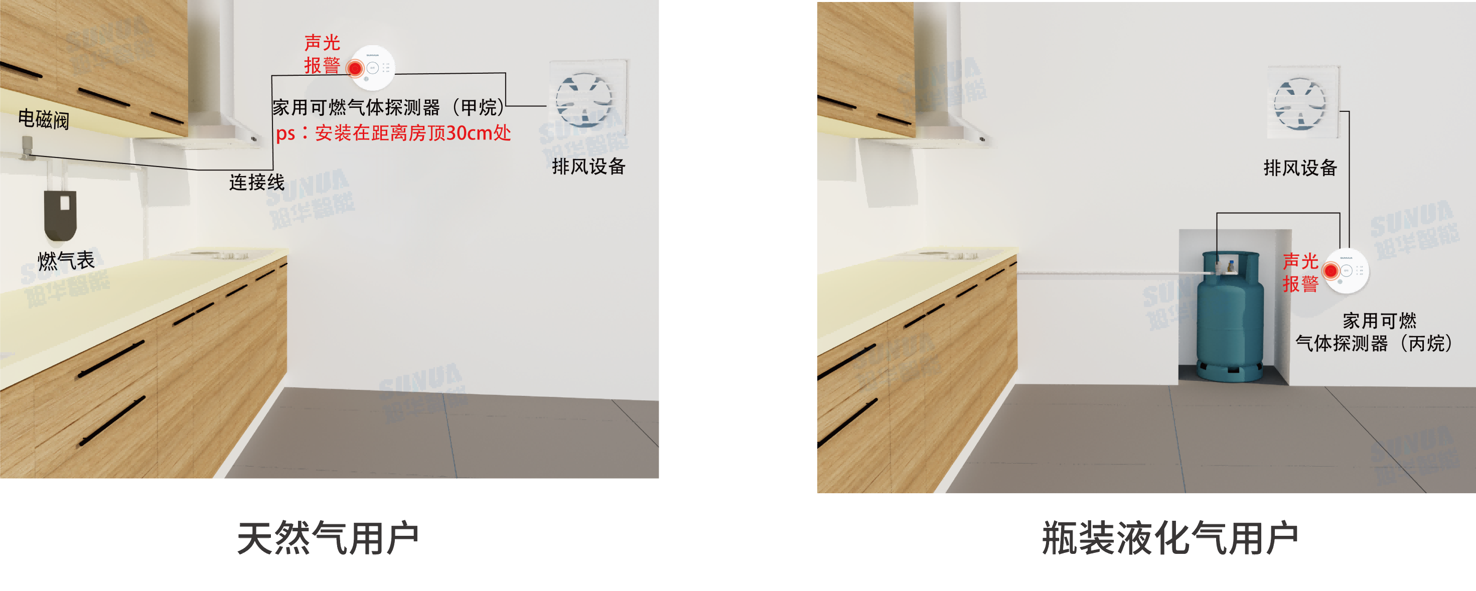 家用可燃气体探测器用于监测居民用户家庭环境的可燃气体浓度,一旦浓度达到报警设定值,即刻发出声光报警信号。同时可以外接电磁阀/机械手、排风扇等设备,用于在报警时第一时间切断阀门,开启排风设备,避免发生爆炸、火灾等事故。