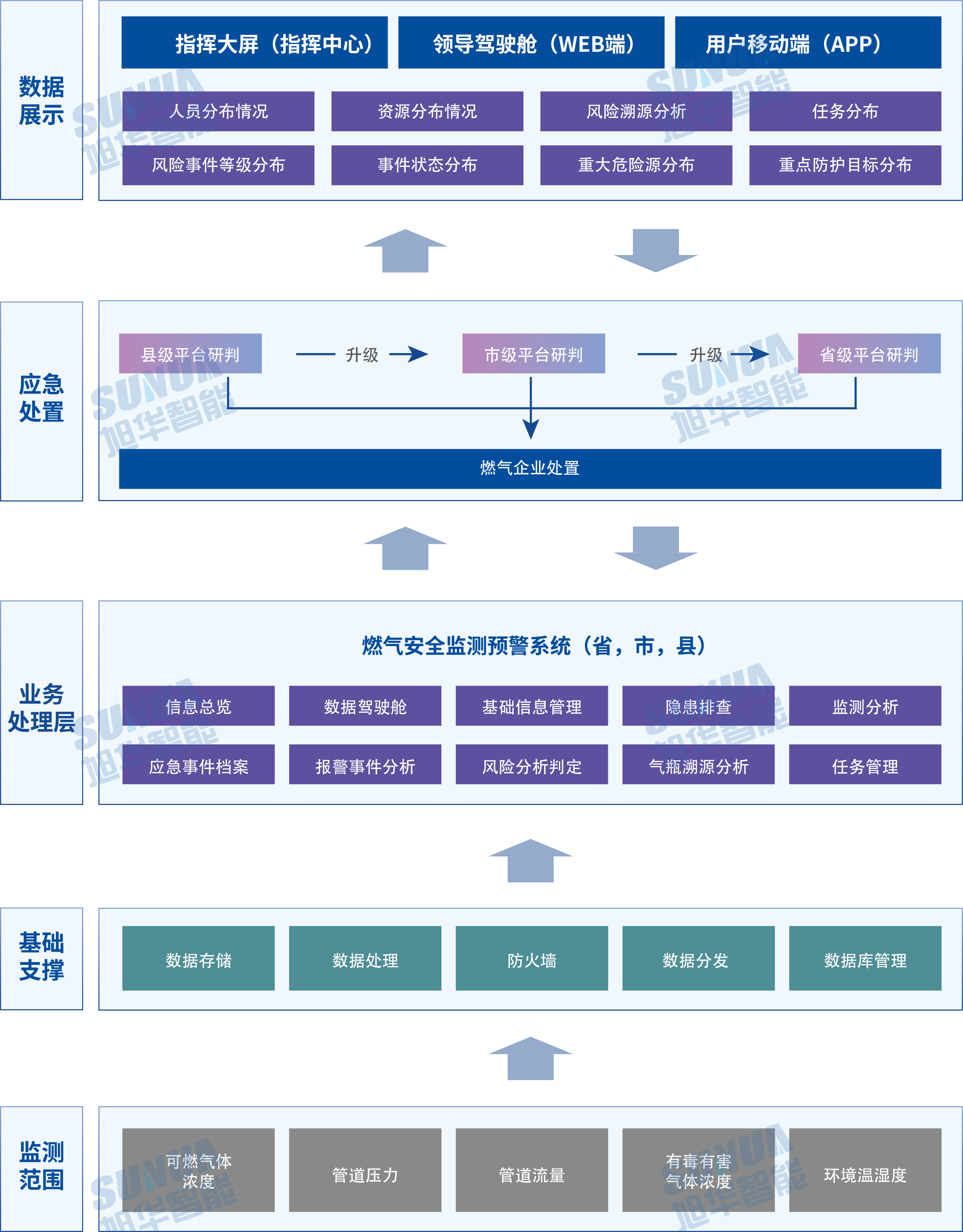 基于物联网、大数据、云计算和人工智能等前沿技术,帮助政府燃气安全监管部门打造行业领先的综合化、智能化、可视化监管平台,将燃气门站、液化气供应站、汽车加气站、管道燃气、瓶装燃气等燃气企业纳入管理对象,保障燃气安全、提高整体工作效率、风险防控水平和决策分析能力,提升公共服务水平,实现“三级监管,四级联网”。
