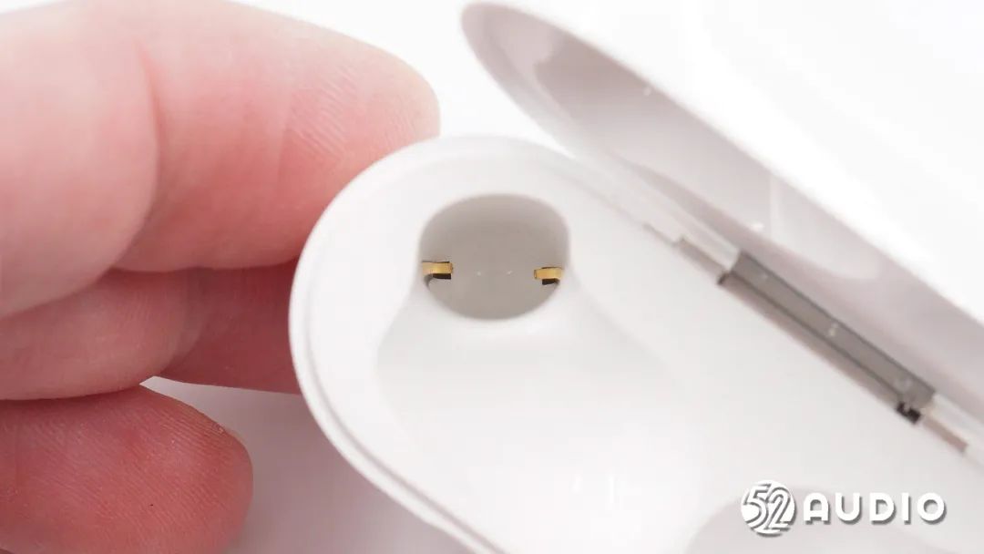 耳机柄座舱底部充电盒为耳机充电的金属弹片特写。
