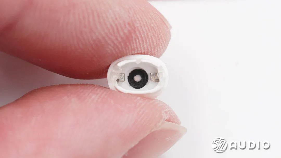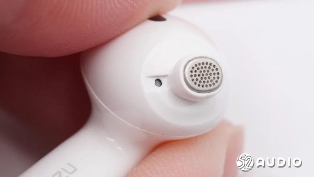 耳机内侧搭载有光学传感器,用于入耳检测功能。旁边是一颗小的泄压孔。