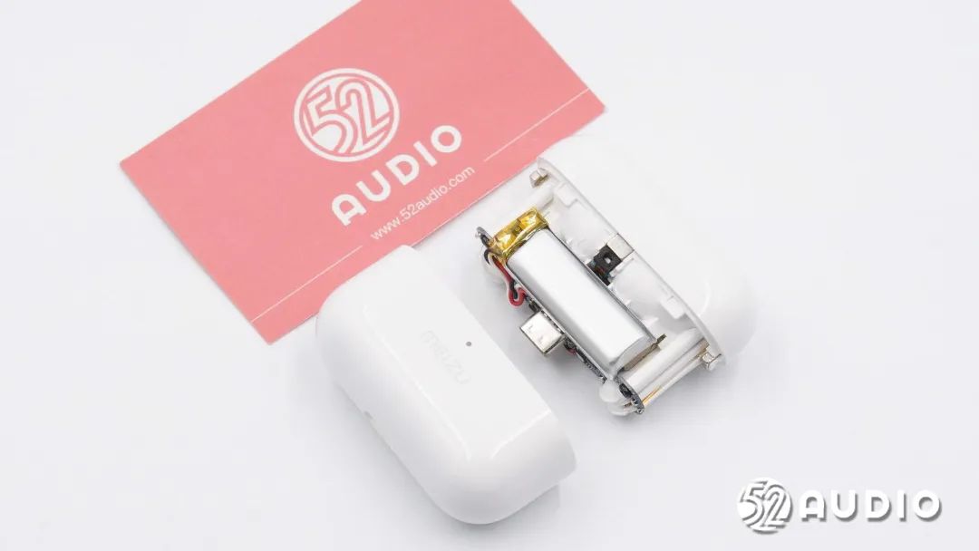 内部电路方面,充电盒内置紫建电子300mAh电池,采用了Type-C接口输入电源,由钰泰半导体ETA9697电源管理芯片负责充电盒内置电池的充放电管理;还采用了芯导科技P14C5N输入过压过流保护芯片,以及用于整机控制的华大半导体HC32F003C4UA单片机。