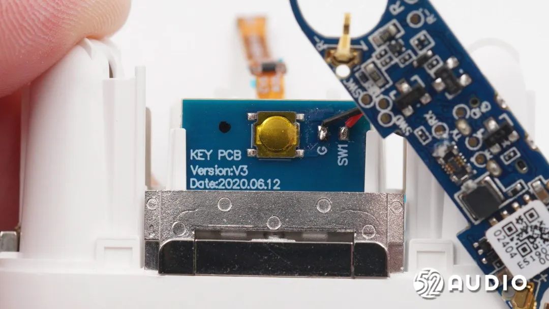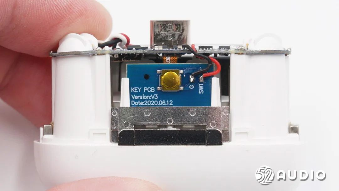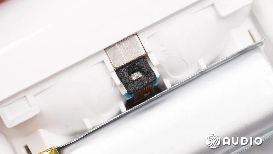 取出电池,前腔内部还设置有金属盖板隔离,用于降低干扰,提升声学性能。