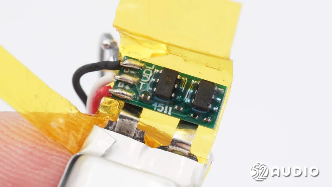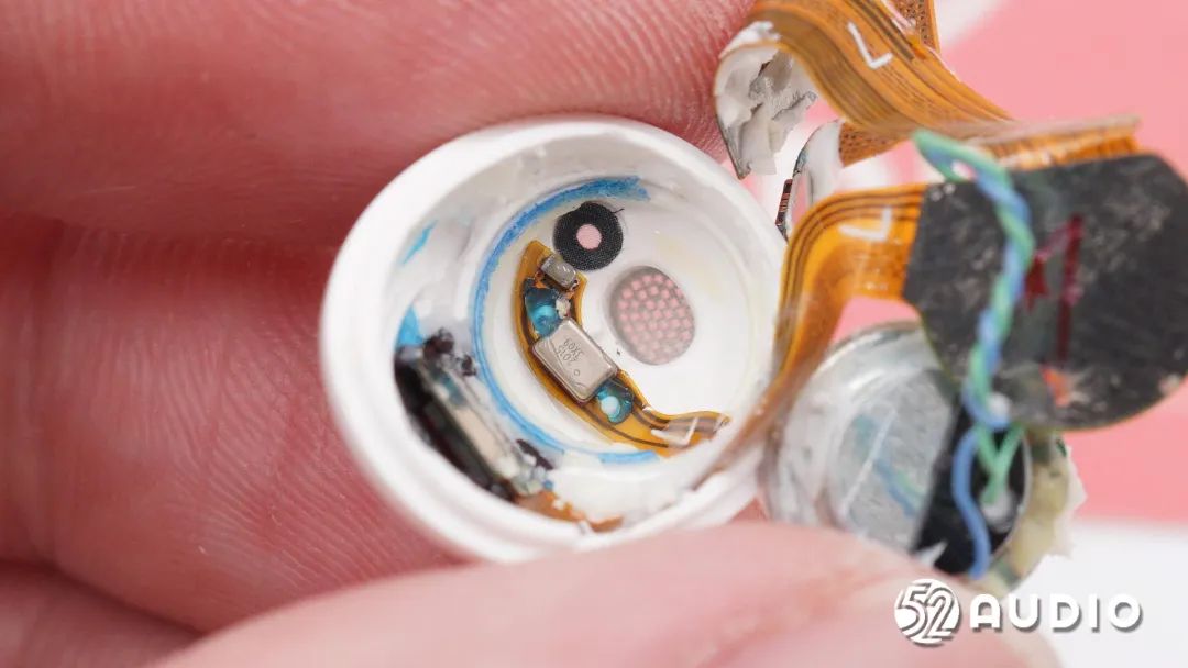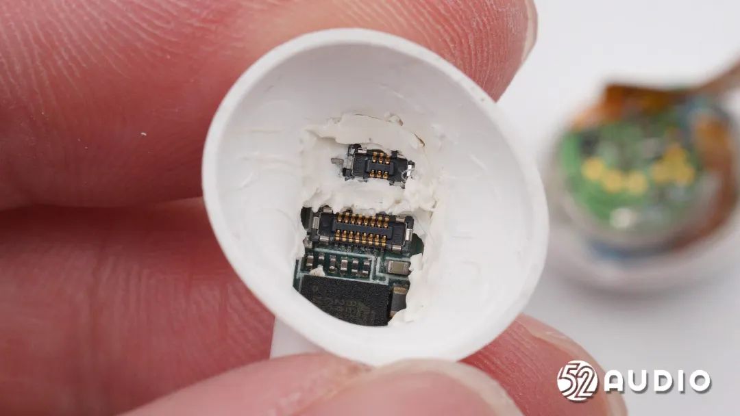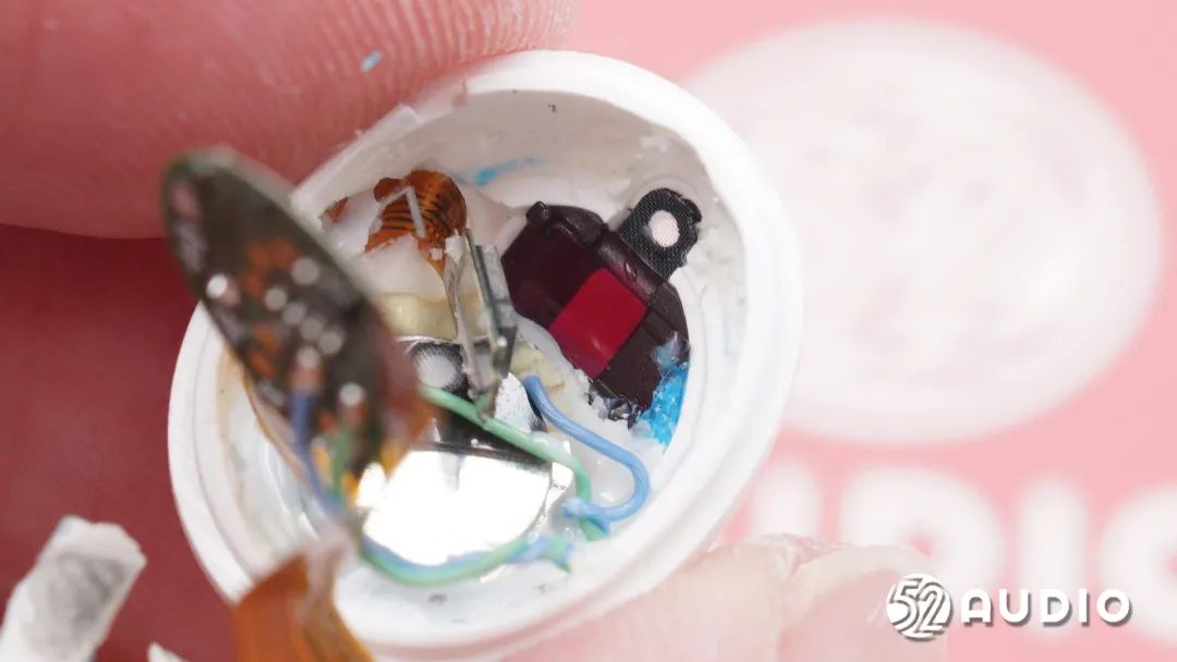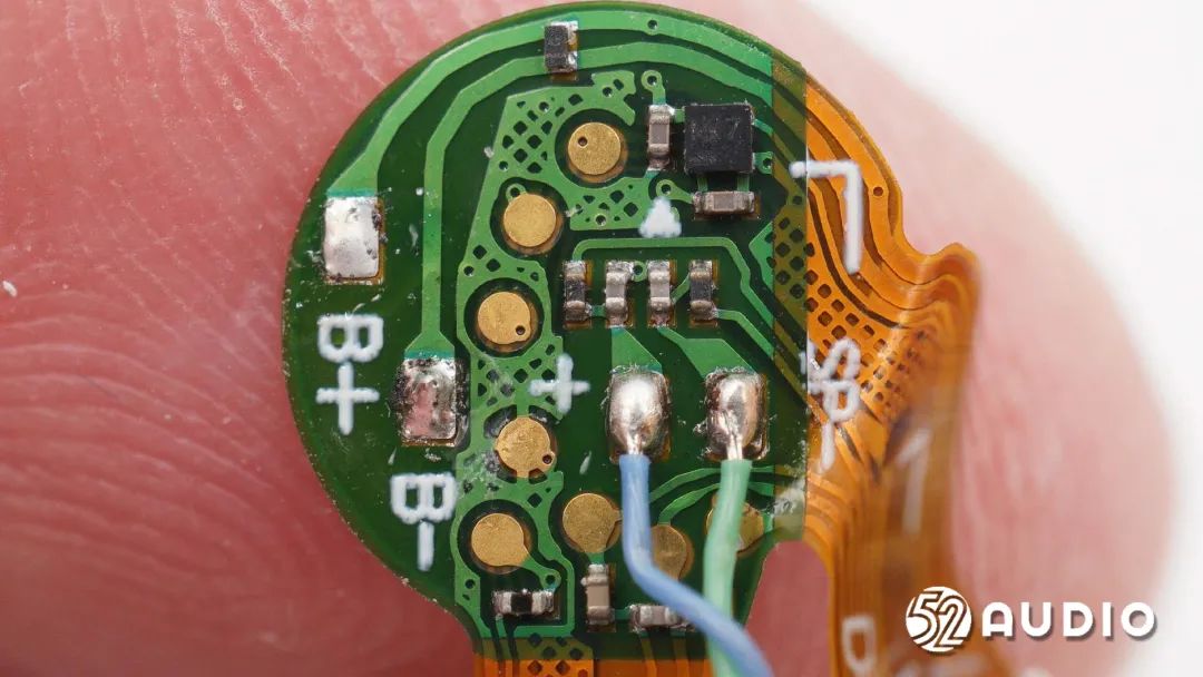 耳机头内部组件顺利获得排线连接到耳机柄内主板,电池上方贴有一片圆形小板。