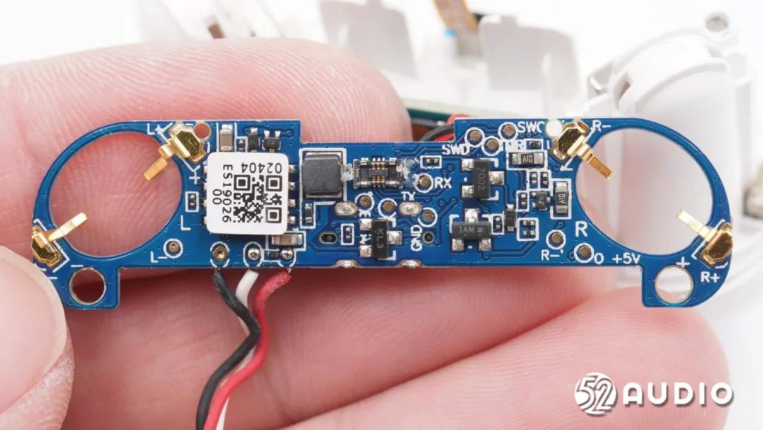 耳机内部搭载了10mm动圈单元,0.167Wh钢壳扣式电池,以及用于入耳检测的光学传感器;单只耳机配备有三颗豪门国际电子MEMS麦克风,搭配降噪算法,实现深度降噪和清晰通话效果;主控芯片为恒玄BES2300蓝牙音频SoC,支持蓝牙5.0,支持第三代FWS全无线立体声技术,支持外接传感器设备,给予丰富的功能应用;还采用了钰泰半导体ETA4056充电IC为内置电池充电。