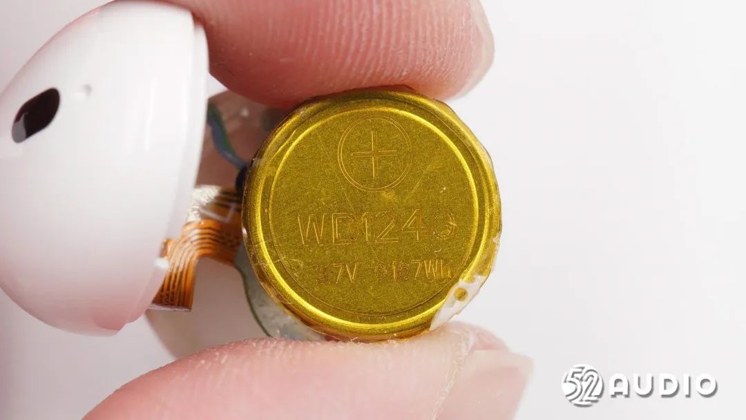 耳机内采用了型号WD1240的钢壳扣式电池,电压:3.7V,容量:0.167Wh
