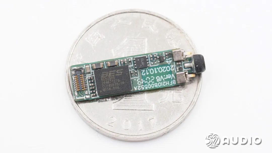 耳机主板与一元硬币大小对比。