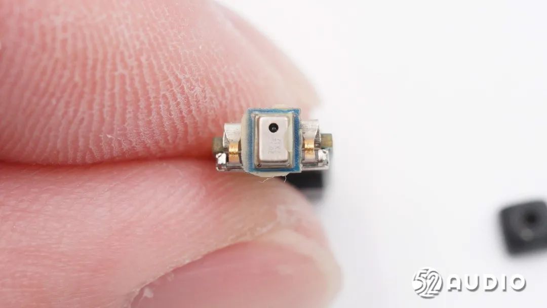 扬声器下方内窥降噪麦克风特写,为镭雕2015 3X09MEMS麦克风,同样来自豪门国际电子,用于降噪功能拾取耳道内部环境噪音。
