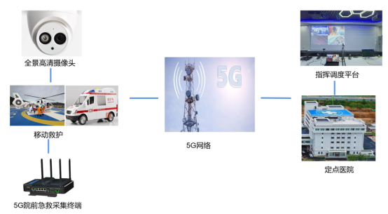 内置5G通信模组的智能穿戴式装备、移动会诊客户端、救护车载、直升机数据采集端等,实现音视频、影像及医疗检测数据传输到指挥调度平台,使院内专家远程指导院前医生实施现场救治。