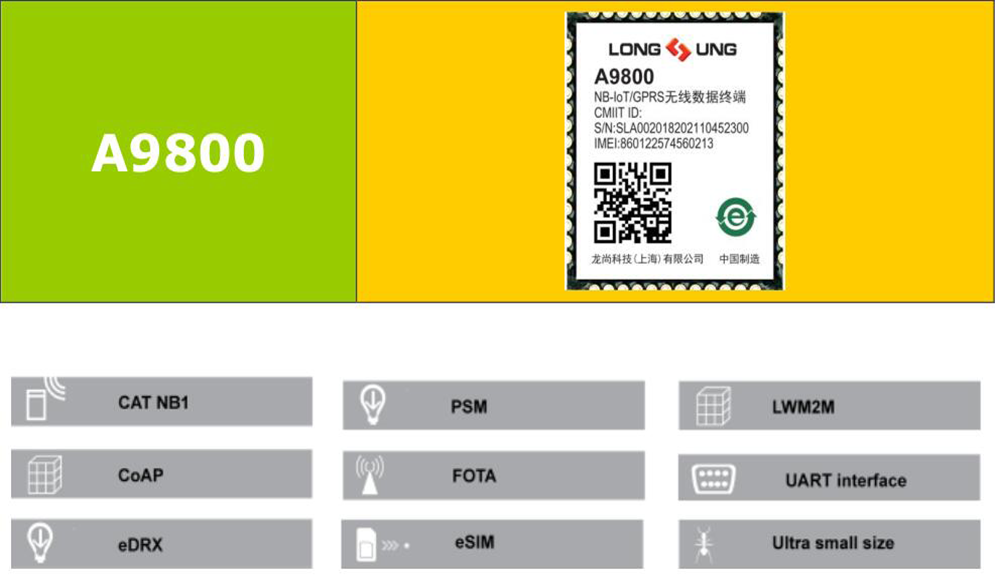 Longsung A9800 is one of the smallest NB-IoT/GPRS modules in LCC castellation packaging with the compact size of 20.0 × 24.0 × 2.5mm, ultra low power consumption and extended temperature range.